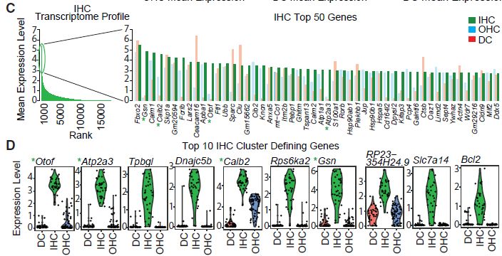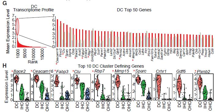 為了定義每種細(xì)胞類型的特征性表達(dá)譜,通過cluster內(nèi)各個(gè)細(xì)胞的標(biāo)準(zhǔn)化表達(dá)水平對(duì)所有基因進(jìn)行排序。每種細(xì)胞類型的表達(dá)譜通過少量高表達(dá)基因(對(duì)數(shù)平均表達(dá)水平在2和7之間)和大量低表達(dá)基因(對(duì)數(shù)平均表達(dá)水平<2)來表征(圖2C,2E和2G)。在按細(xì)胞類型排名前50的最高表達(dá)基因中,一些基因,如Fbxo2和Skpa1,在所有3種細(xì)胞類型中高度表達(dá);而其他基因,如Ocm和Fgfr3,主要僅在一種細(xì)胞類型中表達(dá)。使用AUC排序,提取每組的cluster定義基因以鑒定特定細(xì)胞類型特異性marker基因(圖2D,2F和2H)。前10個(gè)cluter定義基因的小提琴圖揭示了眾所周知的marker基因OHC(Ocm和Slc26a5)、IHC(Otof和Atp2a3)和DC(Bace2和Ceacam16)。可以通過scRNA-Seq瀏覽器工具(Web資源:https://morlscrnaseq.org/)訪問小提琴圖對(duì)應(yīng)的完整基因列表。