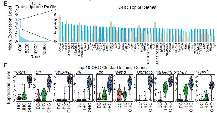 單細(xì)胞RNA-seq可鑒定內(nèi)毛細(xì)胞(inner?hair?cells,IHCs)和外毛細(xì)胞(outlier?hair?cells,OHCs)定義基因;