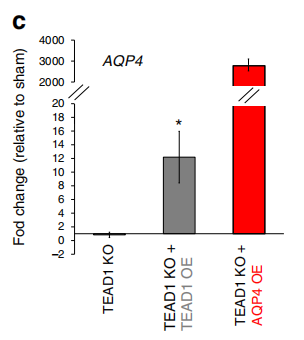 在對照和TEAD1KO細胞中過表達AQP4后,細胞的遷移能力提高了~ 50%,說明AQP4在GBM遷移中發(fā)揮了一定作用。且過表達TEAD1后不僅促進細胞的遷移,同時也上調(diào)了AQP4的內(nèi)源性表達。因此,TEAD1和其下游靶基因AQP4的表達在促進原發(fā)性GBM細胞的遷移中存在直接的機制聯(lián)系。