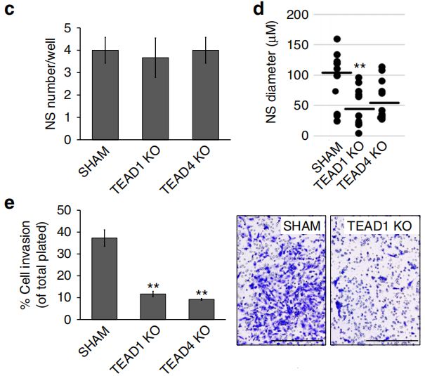 作者通過ATAC-seq繪制了膠質(zhì)母細胞瘤干細胞(GSC)和神經(jīng)干細胞(NSPC)的全基因組染色質(zhì)開放區(qū)域圖譜,并結(jié)合轉(zhuǎn)錄組測序數(shù)據(jù)發(fā)現(xiàn)了在腫瘤細胞遷移中起關(guān)鍵作用的轉(zhuǎn)錄因子TEAD1,并通過細胞和異種移植模型水平上的TEAD1的敲除與過表達的體內(nèi)外功能驗證實驗,驗證了TEAD1促進遷移的功能性作用。