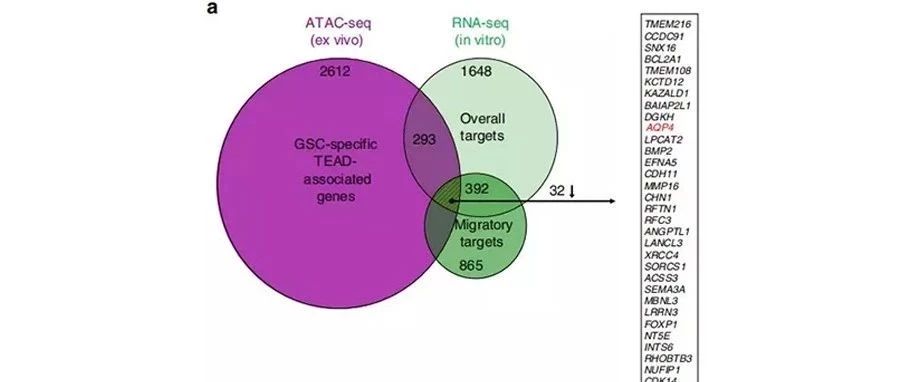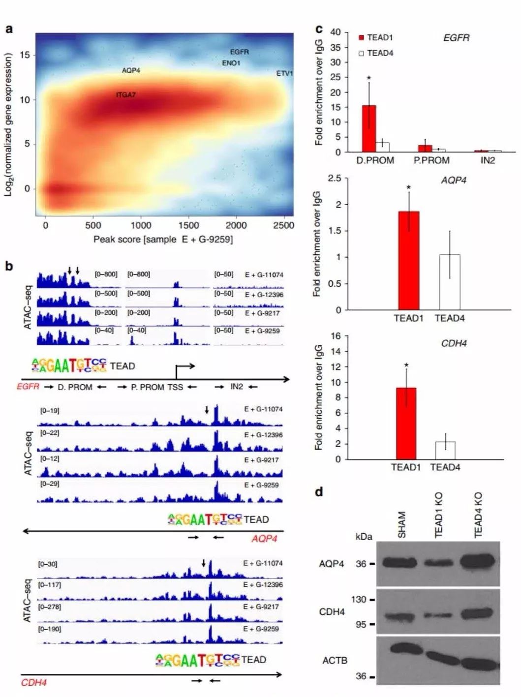 GSC中TEAD1可接近區(qū)域peak(ATAC-seq)和基因表達水平(RNA-seq)的一致性分析,結(jié)合GBM中TEAD1與基因共表達(TCGA中的GBM RNA-seq數(shù)據(jù))分析,發(fā)現(xiàn)TEAD1的靶基因包括EGFR、AQP4、CDH4、TNC等多個候選靶基因。
