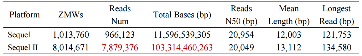 百邁客利用某海洋動(dòng)物樣本通過(guò)構(gòu)建相同文庫(kù),進(jìn)行不同平臺(tái)的數(shù)據(jù)測(cè)試。通過(guò)構(gòu)建20 Kb的文庫(kù),同時(shí)在Sequel與SequelⅡ上進(jìn)行上機(jī)測(cè)序,數(shù)據(jù)產(chǎn)出結(jié)果如下所示: