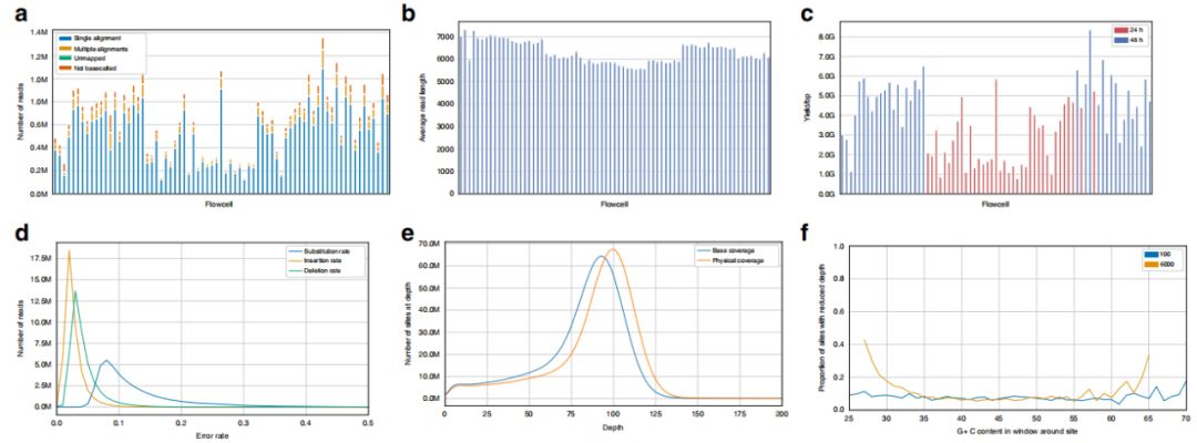 GM12878人B淋巴細(xì)胞采用PCR擴增和6kb片段篩選的文庫制備方案,共計獲得45,740,123條reads(圖1a),平均讀取長度為6373bp(圖1b)在流動細(xì)胞中是一致的,并且基于測序文庫的物理大小選擇非常接近預(yù)期??倲?shù)據(jù)量為273.4Gb,每個flow cell的平均產(chǎn)量為3.7Gb(圖1c)??傆?2,924,782個高質(zhì)量clean reads的比對率為99.3%,唯一比對率為88.8%。