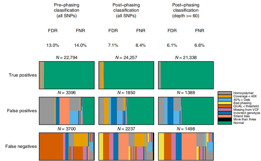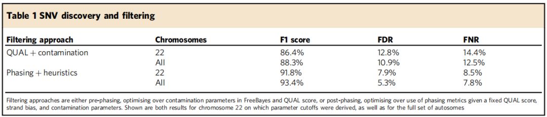 使用過濾器改進(jìn)變異檢測,通過phasing和注釋過濾器(Post?phasing classification)顯著改善變異檢測,*佳結(jié)果F1評分為92.2%,F(xiàn)DR為7.1%,F(xiàn)NR為8.5%(表1,圖2中)。進(jìn)一步考慮覆蓋深度>=60X的假定變異位點(基因組的85%)時,觀察到F1得分改善至93.6%,F(xiàn)DR為6.1%,F(xiàn)NR為6.6%(圖2右),這意味著減少或消除覆蓋深度偏差源(如PCR)的操作改進(jìn)在提高z確性方面可以發(fā)揮一定作用。(百邁客目前ONT全基因組重測序和ONT全基因組甲基化測序建庫過程正是PCR-free建庫–direct-DNA建庫,一是可減少覆蓋深度偏好,有利于提高變異檢測z確度;二是可以保留堿基修飾信息,同時檢測甲基化修飾等信息)