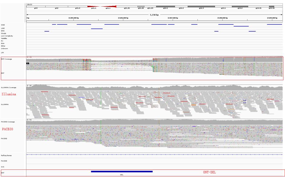大的結(jié)構(gòu)變異相對于snp和indel少見,但其對罕見疾病的影響可能甚至比目前估計的更大,因為現(xiàn)有分析檢測這些突變存在技術(shù)困難。采用Sniffles檢測22號染色體SV變異,共計檢測到82個,其中22個是在GIAB真實數(shù)據(jù)集中存在的,之后通過ONT、Illumina和PacBio reads覆蓋數(shù)據(jù)來判斷剩余的60個SV:其中21個SV被Pacbio檢測到或reads強烈支持,31個SV僅ONT reads明顯證實,但PacBio reads很少或不支持。ONT特異性檢測SV可能代表其他技術(shù)遺漏的真實缺失、由PCR擴增產(chǎn)生的假象或在NA12878細(xì)胞系的細(xì)胞培養(yǎng)期間發(fā)生的亞克隆缺失。作者發(fā)現(xiàn)目前ONT平臺允許檢測大的缺失,靈敏度在60%-91%(21/35和32/35)。