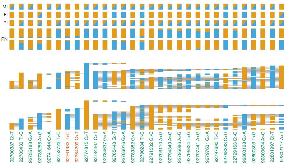 注:前3行為未定相母親(MI),父親(FI),先證者(PI)基因型,第4行為先證者單倍型Phased proband genotypes (PN)。藍(lán)色=alt ,橙色=ref。PN下面2行為單倍型1(母系遺傳)或單倍型2(父系遺傳)對應(yīng)的reads,其中對于每條read,堿基是矩形,reads跨度以水平線顯示。間隙代表gap(缺失)。底部顯示物理位置,感興趣的位點為紅色?;贕RCh37 NM_152703.3, 92761932 T>C對應(yīng)于c.3353 A>G,92764209 C>T對應(yīng)于c.1076 G>A。