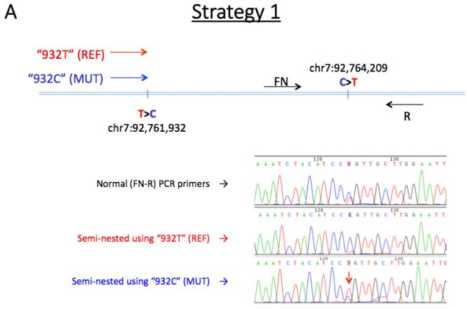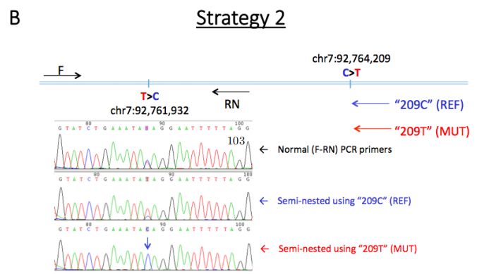 不出所料,ONT數(shù)據(jù)也鑒定到了具有預(yù)期雜合基因型的c.1076 G> A和c.3353 A> G變異。使用ONT reads對其他附近變異進(jìn)行定相,以確認(rèn)新生變異的遺傳和來源(圖3)。這2個新生突變被定相于一個199kb的block內(nèi),33條reads(6.1-18.9kb)跨越2個新生突變位點,11條reads包含新生突變等位基因,8條reads包含2個參考等位基因,表明突變的等位基因是順式的(來自于同一條染色體)。(NA12878數(shù)據(jù)中沒有reads跨越包含2個位點的突變等位基因。)使用一系列等位基因特異性PCR實驗證實來自O(shè)NT reads的新生等位基因的單倍型構(gòu)象。相位區(qū)中的側(cè)翼位點表明,父系遺傳的單倍型出現(xiàn)了新生變異(圖3)。