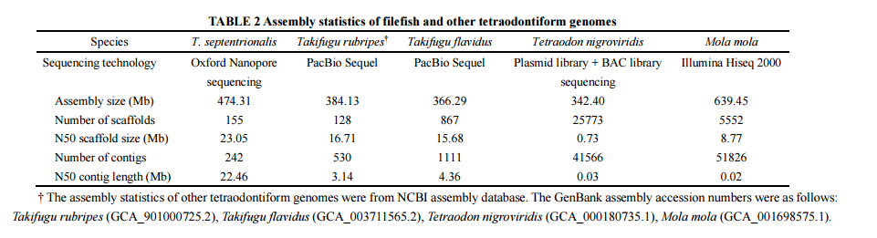 而與近年的一些魚類基因組ContigN50相比,綠鰭馬面鲀基因組組裝的連續(xù)性同樣也是表現(xiàn)超群。從表2中不難發(fā)現(xiàn),近年來魚類基因組ContigN50水平基本在Kb與Mb之間徘徊,而本次使用Nanopore組裝的綠鰭馬面鲀直接上升了一個數(shù)量級,完成了連續(xù)性超強的優(yōu)質(zhì)基因組。