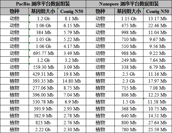 同時通過PacBio和Nanopore雙平臺測序數(shù)據(jù)組裝結(jié)果的比較發(fā)現(xiàn),利用PacBio數(shù)據(jù)進行基因組組裝Contig N50一般達到Mb級別,而利用Nanopore數(shù)據(jù)進行基因組組裝,Contig N50指標平均水平基本能再提升2倍或者更高,甚至許多物種能達到幾十Mb(如百邁客利用Nanopore測序平臺組裝的水產(chǎn)動物綠鰭馬面鲀基因組,Contig N50高達22 Mb)。