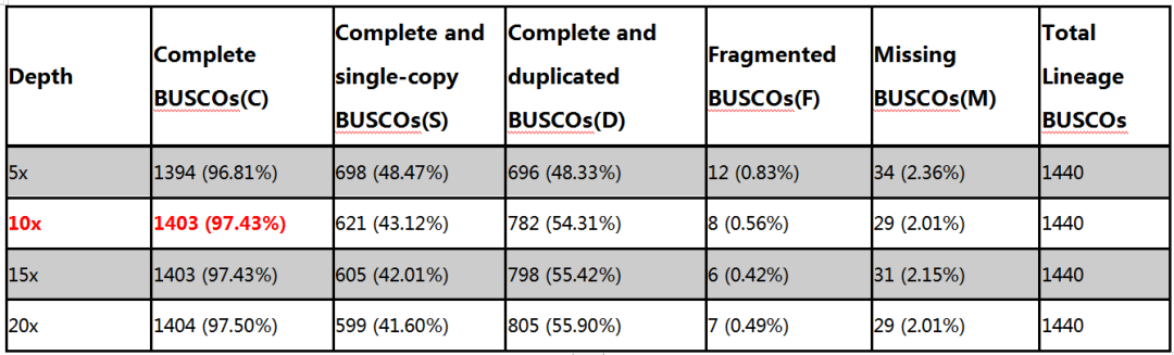 2.?采用不同深度下的PacBio CCS數(shù)據(jù)進行Polish,然后利用真核有胚植物數(shù)據(jù)庫對不同深度PB CCS Polish的結(jié)果進行BUSCO完整性評估,以獲得最佳的CCS數(shù)據(jù)矯正深度,分析結(jié)果如下:
