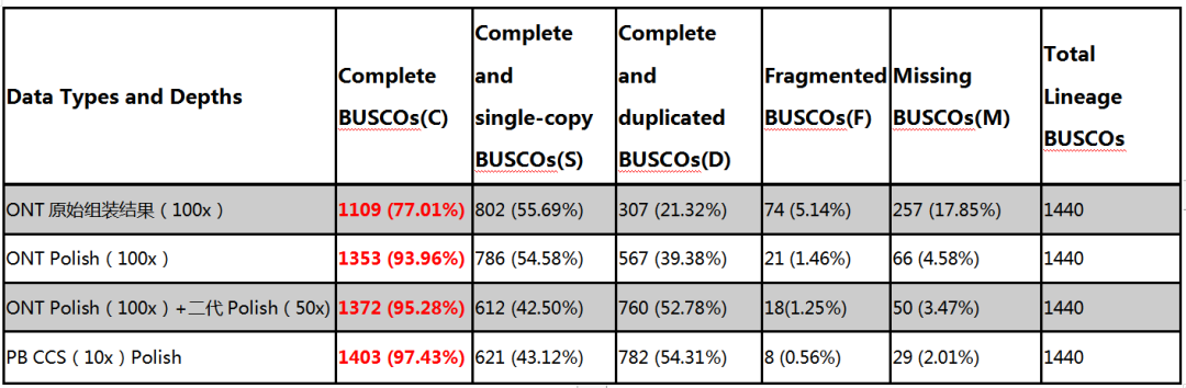 3.?采用不同測序平臺數(shù)據(jù)對Nanopore原始組裝結(jié)果進行Polish,進而利用真核有胚植物數(shù)據(jù)庫進行BUSCO完整性評估,完整性比對結(jié)果如下:
