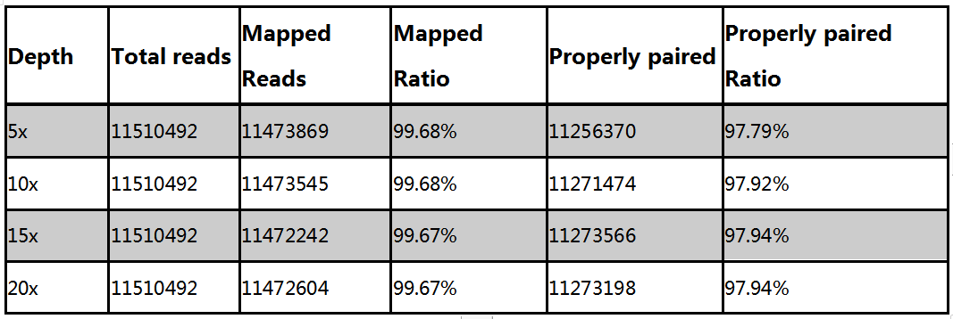 利用5x,10x,15x和20x的PacBio CCS數(shù)據(jù)對基因組進行Polish,然后利用50x的二代數(shù)據(jù)回比到基因組上,最后發(fā)現(xiàn)回比率相當,雙端比對效率97%左右。