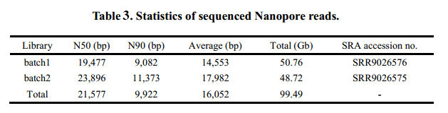 在對同源四倍體紫花苜蓿(Medicago sativa?L.)基因研究中,首先利用了70 GB,~22x PacBio CCS數(shù)據(jù)進行基因組組裝,組裝獲得紫花苜?;蚪M大小3154 Mb,Contig N50=459 kb, 然后利用ALLHiC進行同源染色體組群的劃分,最后通過Hi-C互作熱圖、遺傳圖譜共線性、ONT數(shù)據(jù)回比、BUSCO完整性、轉(zhuǎn)錄組對基因組完整性等進行評估,值得注意的是在ONT數(shù)據(jù)回比評估中(Table 3),文中篩選了99 GB ONT long reads中的最長200條reads(ranged from 95 to 263 Kb)進行回比,發(fā)現(xiàn)89%的的reads都能比對到single染色體上,結(jié)合其它評估方法,進一步說明了組裝及染色體位置的準確性。
