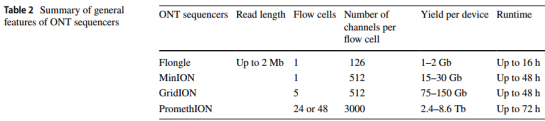 Oxford Nanopore ?Technologies(ONT)創(chuàng)立了單分子納米孔測序,其主要原理是當單鏈DNA/RNA分子的核酸堿基蛋白納米孔時(固定在鹽溶液浸沒膜上的蛋白質(zhì)納米孔,固定膜上施加了固定電壓),通過創(chuàng)新的技術識別離子電流的微小變化,即:當DNA分子穿過納米孔時,相對于每個核苷酸,都會獲得不同的電流信號。記錄每個孔的離子電流變化,并基于馬爾可夫模型或遞歸神經(jīng)網(wǎng)絡的方法將其轉(zhuǎn)換為堿基序列(圖3)。其優(yōu)勢之一是支持RNA直接測序,除此之外,Ultra-long reads (ULRs) 是ONT平臺的另一重要特征,并具有促進大型基因組組裝的潛力。Nanopore測序平臺相繼推出MinION,GridION,PromethION及Flongle平臺并投入使用(Table 2)。
