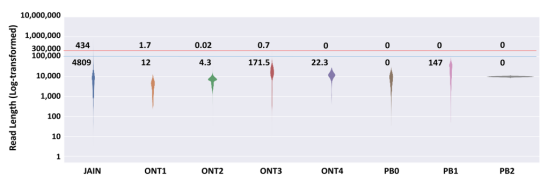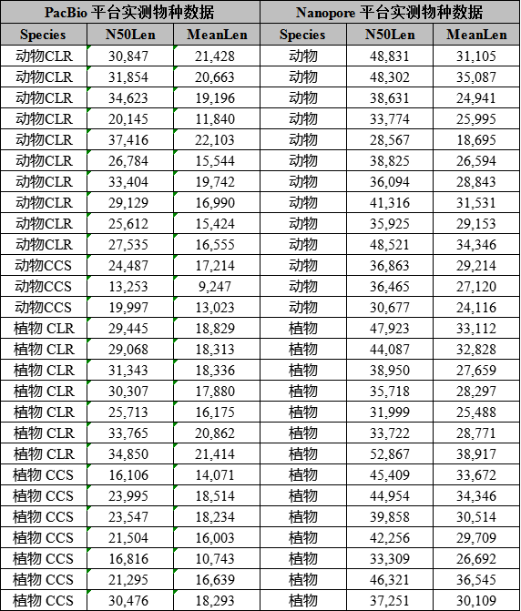 通過雙平臺實測數(shù)據(jù)的比較分析: Nanopore平臺平均讀長為28.5 Kb左右,Reads N50平均讀長 38Kb左右;PacBio CLR平均讀長20 Kb左右,Reads N50平均讀長 28Kb左右;CCS平均讀長12-15 Kb,Reads N50 16~18Kb,發(fā)現(xiàn)Nanopore比PacBio平臺讀長高10 Kb左右,而PacBio CCS模式讀長遠低于CLR模式。