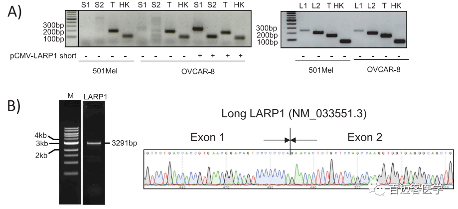 特異性引物擴(kuò)增及sanger測(cè)序驗(yàn)證實(shí)驗(yàn):為了驗(yàn)證ONT全長(zhǎng)轉(zhuǎn)錄組測(cè)序發(fā)現(xiàn)的LI-LARP1是主要isoform,作者設(shè)計(jì)了2對(duì)特異性引物,以通過(guò)PCR檢測(cè)短或長(zhǎng)LARP1 isoform或2種總和(使用保守的exon 7上的引物,此處稱為“總LARP1”)(圖3)。設(shè)計(jì)對(duì)應(yīng)于每個(gè)LARP1 isoform外顯子1的正向引物和下游外顯子的外顯子連接處的反向引物。這些引物有效性通過(guò)重組SI-LARP1或LI-LARP1表達(dá)后的成功擴(kuò)增得到證實(shí)。設(shè)計(jì)用于檢測(cè)總LARP1的引物,以在所有預(yù)測(cè)的isoform共有的第7外顯子上退火。結(jié)果發(fā)現(xiàn)LI-LARP1在501-MEL(黑色素瘤細(xì)胞系)和OVCAR-8細(xì)胞中表達(dá),但未檢測(cè)到SI-LARP1的PCR擴(kuò)增產(chǎn)物(圖3A)。對(duì)所有PCR產(chǎn)物進(jìn)行測(cè)序以驗(yàn)證所需的擴(kuò)增子。接下來(lái),設(shè)計(jì)了對(duì)長(zhǎng)LARP1 isoform(LI-LARP1)的開(kāi)放閱讀框具有特異性的引物,并通過(guò)cDNA文庫(kù)中的PCR進(jìn)行了擴(kuò)增,PCR產(chǎn)物的sanger測(cè)序結(jié)果揭示了LI-LARP1預(yù)測(cè)的完整核苷酸序列,包括其特定的外顯子1(圖3B)。值得注意的是,所有試圖擴(kuò)增SI LARP1 isoform編碼序列的嘗試均告以失敗,表明該isoform在得到的cDNA文庫(kù)中不存在。