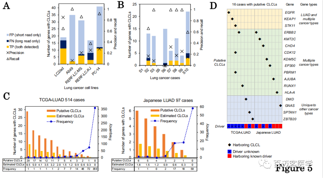 盡管對于所有細(xì)胞系和臨床樣品,使用短讀長數(shù)據(jù)分別估計21%和72%的CLCL檢測z確度和重復(fù)檢出率,但將構(gòu)建的分析流程應(yīng)用于514個 TCGA肺腺癌(TCGA-LUAD)和97個日本肺腺癌(Japanese LUAD)樣本全外顯子組測序數(shù)據(jù),通過分別從TCGA-LUAD和日本LUAD病例中進(jìn)行軟切割reads分析,共檢測到269個和50個具有串聯(lián)重復(fù)結(jié)構(gòu)的連接點,這些結(jié)構(gòu)可能對應(yīng)于CLCL(每個病例1至29個基因)??傆嫃?55(30%)TCGA-LUAD和39(40%)日本LUAD病例中提取了候選CLCL(圖5C)。