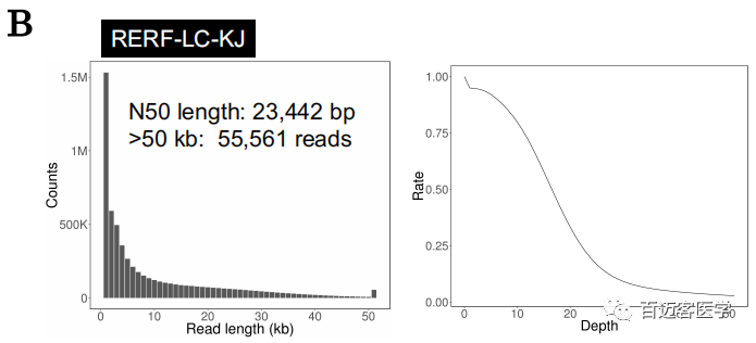 在完成對從MinION和PromethION數(shù)據(jù)的初步評估后,作者對另外4個肺癌細(xì)胞系(A549、REFF-LC-KJ、RELF-LC-MS和PC-14)進(jìn)行了MinION和PromethION測序,分別覆蓋了9.5-18.5X基因組,例如,在RERF-LC-KJ測序中,產(chǎn)生了5,986,875個reads(總堿基數(shù)57,062,227,853 bp,18.5x),Reads*長長度和N50長度分別為922,768 bp和23,442 bp。