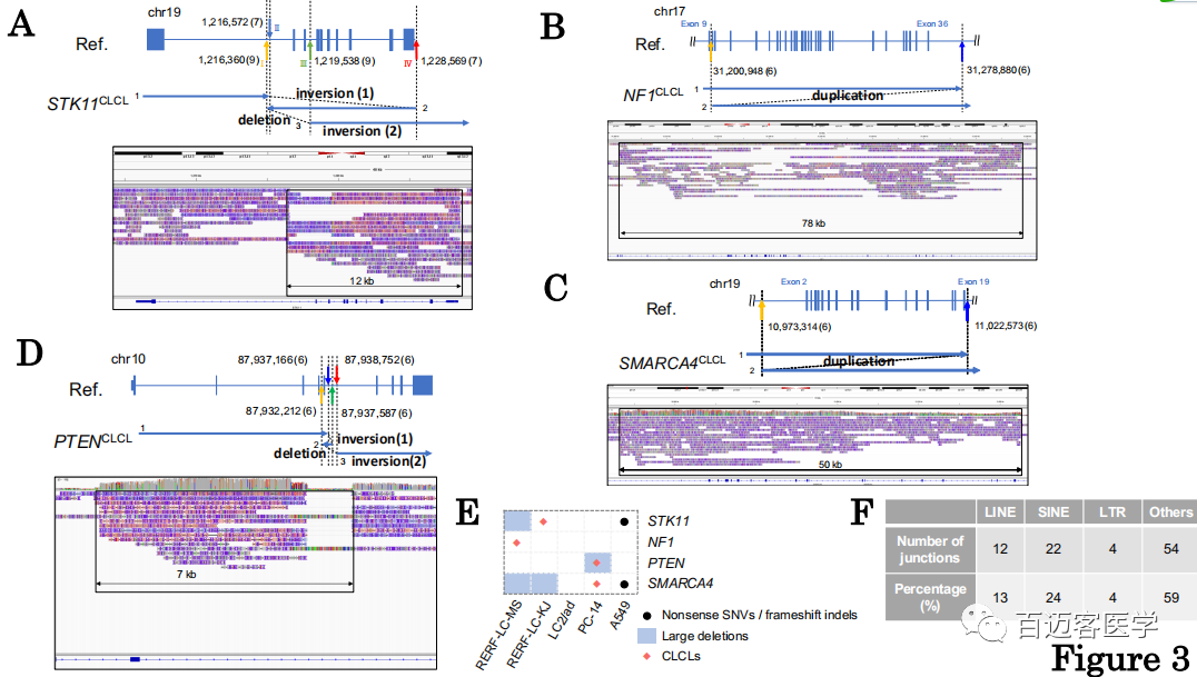 在其他細(xì)胞系中也成功鑒定出以下數(shù)量的CLCL:LC2/ad中有16個,A549中有1個,RERF-LC-KJ中有7個,RELF-LC-MS中有7個,PC-14中有11個。重要的是,CLCLs甚至出現(xiàn)在關(guān)鍵的癌癥基因中,例如STK11,NF1,SMARCA4和PTEN基因。異常的結(jié)構(gòu)各不相同,并且由于其復(fù)雜的結(jié)構(gòu)和受累區(qū)域的大小,傳統(tǒng)的基于短讀長測序分析的方法不易檢測到它們中的大多數(shù)。相對簡單的一種是在RERF-LC-MS細(xì)胞的NF1基因中檢測到的(圖3B),內(nèi)含子9(chr17:31,200,948)和最后一個外顯子36的下游區(qū)域(chr17:31,278,880;在交界處有6條reads支持)之間的串聯(lián)串聯(lián)重復(fù)。在另一種情況下,SMARCA4 CLCL的結(jié)構(gòu)顯示出從內(nèi)含子1(chr19:10,973,314)到內(nèi)含子20(chr19:11,022,573;在交界處有8條reads支持;圖3C)。在PC-14中的PTEN結(jié)構(gòu)中發(fā)現(xiàn)了更復(fù)雜的情況,該CLCL是倒位和缺失的組合(圖3D)。在這些相對簡單的情況下,將Illumina短reads重新映射到已發(fā)現(xiàn)的junction位點可驗證重建結(jié)構(gòu)的√確識別。