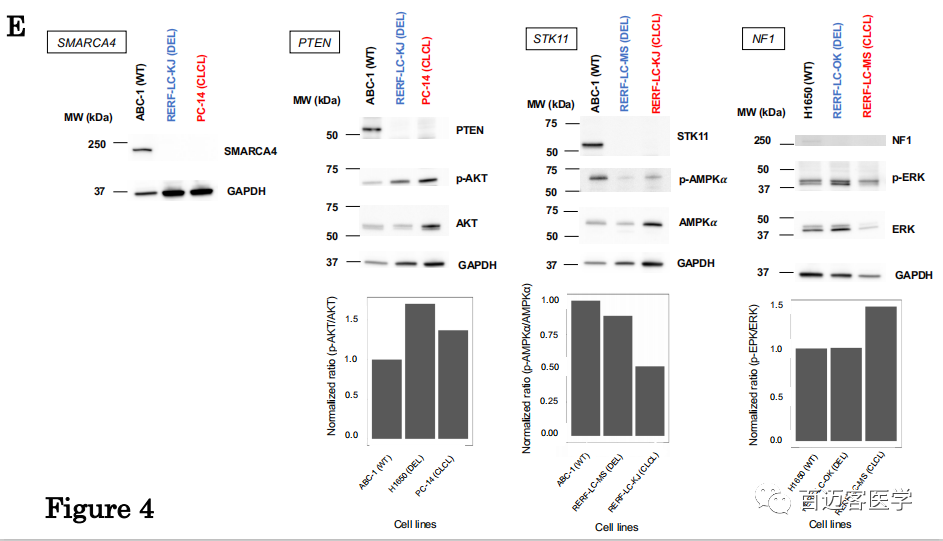 為了解決CLCL的生物學(xué)意義,作者研究了受CLCL影響的基因座如何引起蛋白質(zhì)表達(dá)水平及其相關(guān)信號通路變化。蛋白質(zhì)印跡WB分析發(fā)現(xiàn)STK11,NF1,SMARCA4和PTEN的蛋白質(zhì)在這些基因中帶有CLCL的細(xì)胞中完全丟失了(圖4E)。進(jìn)一步檢查了下游蛋白的激活狀態(tài),在所有檢查的case中均觀察到了預(yù)期的信號通路破壞。磷酸化的AKT(phospho-AKT)相應(yīng)地激活mTOR信號通路,而PTEN抑制AKT的磷酸化。觀察到phospho-AKT異常上調(diào),反映了PC-14細(xì)胞(PTEN-CLCL)中PTEN的功能喪失。AMPK是在維持細(xì)胞動態(tài)平衡中起重要作用的基因,AMPK蛋白在其α亞基處的磷酸化被STK11激活。在RERF-LC-KJ細(xì)胞(STK11-CLCL)中,其激活受到損害。NF1基因是RAS的負(fù)調(diào)控因子,位于RAS信號通路下游的磷酸化ERK在RERF-LC-MS細(xì)胞(NF1-CLCL)中異常上調(diào)。無論是由于常規(guī)畸變還是CLCL,相應(yīng)基因的蛋白質(zhì)明顯丟失,但其后果仍會根據(jù)情況而有所不同。例如,即使STK11蛋白在RERF-LC-MS細(xì)胞(STK11缺失)和RERF-LC-KJ細(xì)胞(STK11-CLCL)中類似地消失,在RERF-LC-KJ細(xì)胞(STK11-CLCL)中磷酸-AMPKα的增強比例也更高。RERF-LC-OK(NF1-缺失)細(xì)胞系中NF1蛋白影響幾乎無法檢測到,而對RERF-LC-MS細(xì)胞(NF1-CLCL)的影響卻很明顯。表明,其他途徑有時可以彌補關(guān)鍵蛋白的缺失。
