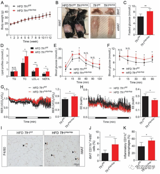 為了進(jìn)一步探究Tfr1基因在棕色/米色脂肪細(xì)胞的發(fā)育和產(chǎn)熱能力維持的過程的作用機(jī)制。分別對Tfr1Adp/Adp和Tfr1fl/fl 進(jìn)行高脂肪、正常喂養(yǎng),并對4組樣本分別進(jìn)行葡萄糖耐量、胰島素抵抗、呼吸速率、能量消耗、CD11b+F4/80巨噬細(xì)胞、CD11c+巨噬細(xì)胞的比例等實(shí)驗(yàn)。數(shù)據(jù)表明在高脂肪處理實(shí)驗(yàn)組 中,整體體重(Fig3 A)、白色脂肪組織(Fig3 B)大小都沒有明顯的差異。然而在高脂實(shí)驗(yàn)組中棕色脂肪組織完全轉(zhuǎn)化為白色脂肪組織(Fig3 B)。同時小鼠空腹血糖、血脂、非酯化脂肪酸脂肪酸的含量明顯高于高脂對照組。高脂喂養(yǎng)后,盡管血液中血糖含量沒有太大的變化,但是驗(yàn)組中葡萄糖耐量、胰島素抵抗的值都要高于高脂對照組(Fig3E/F)。這說明高脂實(shí)驗(yàn)組中糖耐受性受損可能是導(dǎo)致空腹血糖升高的原因。而呼吸速率、能量消耗的實(shí)驗(yàn)表明缺失Tfr1基因后呼吸速率會增加,能量消耗能力降低(Fig3G/H)。在正常喂養(yǎng)的實(shí)驗(yàn)組中白色脂肪組織相對于正常對照組來說明顯減少。 上述數(shù)據(jù)表明,能量消耗降低并沒有導(dǎo)致高脂喂養(yǎng)實(shí)驗(yàn)組小鼠體重增加,可能是由于Tfr1缺失對白色脂肪細(xì)胞的內(nèi)在的影響。