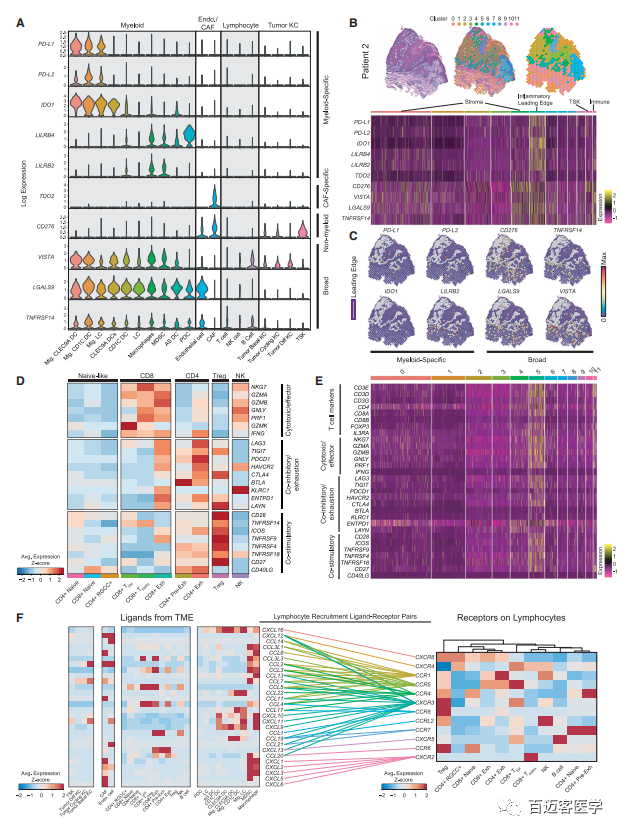 為了探究何種細(xì)胞類型影響了cSCC的免疫活動(dòng),我們調(diào)查了熟知的免疫抑制基因(圖4A),CD274(PD-L1)和PDCD1LG2(PD-L2)等基因在ST中表現(xiàn)出空間簇特異性模式,與特定細(xì)胞類型的共定位一致,骨髓特異性因子在炎癥前沿占據(jù)優(yōu)勢(shì)地位(圖4B&C)。衰竭的CD4和CD8 T細(xì)胞亞群除表達(dá)細(xì)胞毒性基因外,還表達(dá)抑制性受體和衰竭標(biāo)志物(圖4D)。在空間位置上,T細(xì)胞轉(zhuǎn)錄本出現(xiàn)在炎癥前沿和免疫相關(guān)細(xì)胞簇中(圖4E)。并且發(fā)現(xiàn)scRNA-seq中幾種趨化因子受體在重疊的T細(xì)胞亞群中高表達(dá)。Tregs特異性表達(dá)CCR8,這可能是一個(gè)潛在藥物靶點(diǎn)(圖4F)。綜上所述,這些結(jié)果強(qiáng)調(diào)了參與免疫抑制機(jī)制的多種細(xì)胞類型,包括誘導(dǎo)DC和衰竭T細(xì)胞共抑制信號(hào),以及招募Tregs。
