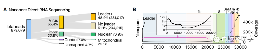 用MinION納米孔測(cè)序儀進(jìn)行了DRS測(cè)序,獲得了879,679個(gè)reads(1.9 Gb)(圖1A)。大部分(65.4%)的reads定位于SARS-CoV-2,表明病毒轉(zhuǎn)錄本占據(jù)主導(dǎo)地位,而宿主基因的表達(dá)被嚴(yán)重抑制。已知DRS無(wú)法對(duì)末端12 nt進(jìn)行測(cè)序,因此序列的5’末端缺失了12 nt(圖1B)。病毒基因組3’端的覆蓋度明顯高于5’端,這也反映了RNA直接測(cè)序從RNA3’端開始測(cè)序的特點(diǎn)。病毒RNA中前導(dǎo)序列(72nt)的普遍存在導(dǎo)致在5’末端出現(xiàn)一個(gè)顯著的峰。在sgRNA的leader-body junction位點(diǎn)檢測(cè)到覆蓋度的明顯下降。此外,觀察到反映出非常規(guī)的“拼接”事件的reads,這樣的融合轉(zhuǎn)錄本導(dǎo)致5’末端覆蓋度的增加(圖1B,插圖)。