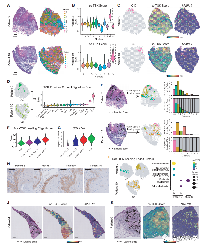 在患者中,腫瘤相關(guān)的斑點簇展現(xiàn)出單細胞測序腫瘤KCs的定位基因表達,同時免疫或間質(zhì)基因與腫瘤臨近間質(zhì)、未受累的間質(zhì)或附件區(qū)域有關(guān)聯(lián),與大體的cSCC結(jié)構(gòu)一致(圖3A)。使用scRNA-seq中TSK標記基因?qū)γ總€空間轉(zhuǎn)錄組斑點評分,顯著突出了一個TSK-high簇,包括TSK標記物MMP10(圖3B&C)。在具有清晰前沿的腫瘤中,TSK鄰近間質(zhì)富集了癌癥相關(guān)成纖維細胞 (CAF)和內(nèi)皮細胞轉(zhuǎn)錄本,表明TSK細胞主要位于纖維血管微環(huán)境中(圖3D)。超過80%的TSK高簇點位于腫瘤前沿,其余的前沿點富集了Basal腫瘤基因(圖3E&F),這種共存關(guān)系通過共表達標志物COL17A1的免疫組化得到進一步確認(圖3G&H)。此外,炎癥反應(yīng)和干擾素信號基因在非TSK前沿表達,與干擾素相關(guān)轉(zhuǎn)錄本在腫瘤基底群體中的存在一致(圖2E&I)。這些結(jié)果確定了TSK、Basal細胞以及TSK近端纖維血管生態(tài)位造成的cSCC腫瘤前沿的異質(zhì)性。