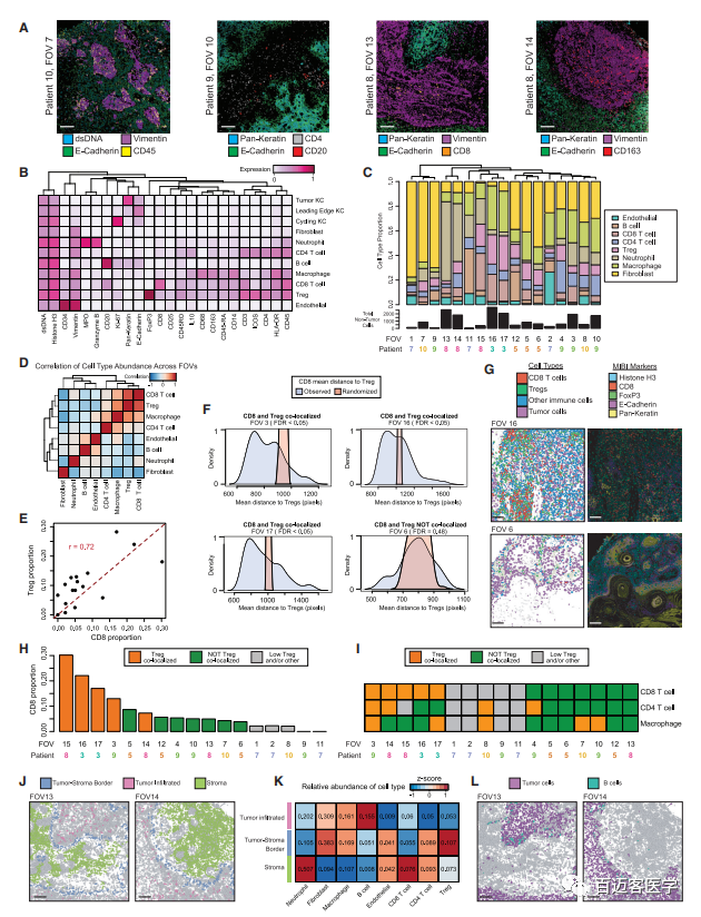 利用多重離子束成像(MIBI)技術(shù),在單細胞分辨率下解析TME的空間組織。我們對6例患者的腫瘤前緣進行了18個視野的MIBI掃描,對38個腫瘤和基質(zhì)/免疫蛋白標志物圖像進行分段,確定了55832個細胞(圖5A),并且聚類分析的主要細胞類型與scRNA-seq細胞類型相似(圖5B)。間質(zhì)和免疫組分在腫瘤內(nèi)和腫瘤間是可變的,12/17的腫瘤患者圖像聚類不一致(圖5C)。腫瘤內(nèi)外的CD8 T細胞、Tregs、巨噬細胞和CD4 T細胞存在高度相關(guān)性,尤其前兩者更甚(圖5D)。5/12視野具備足夠的細胞進行系統(tǒng)分析CD8 T細胞和Tregs距離(圖5F-H),我們發(fā)現(xiàn)了兩者的共定位,并且CD8 T細胞的比例也與共定位呈正相關(guān),表明Tregs受到TME的共招募和CD8 T細胞的共定位共同調(diào)節(jié),另外CD4 T細胞和巨噬細胞與Tregs共定位(圖5I)。成纖維細胞、巨噬細胞和Tregs在腫瘤-間質(zhì)邊緣最豐富,而CD8 T細胞和中性粒細胞被大量排除在腫瘤之外,表明 Treg 定位可能阻止效應(yīng)淋巴細胞進入腫瘤(圖5J&K)。已經(jīng)被發(fā)現(xiàn)可以介導(dǎo)免疫抑制或抗腫瘤活性B細胞是唯一表現(xiàn)出優(yōu)先浸潤的細胞類型。