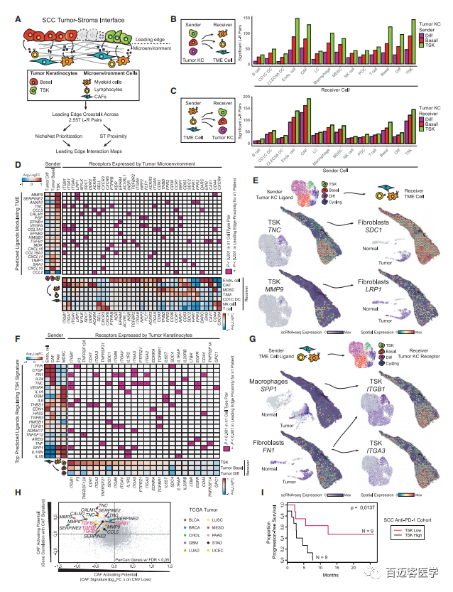 進一步,我們整合scRNA-seq和ST數(shù)據(jù)來描述前沿鄰近腫瘤和TME細胞之間的信號通路(圖6A)?;谂潴w-受體對數(shù)據(jù)庫,TSKs廣參與了自分泌和旁分泌相互作用(主要與CAFs、內(nèi)皮細胞、巨噬細胞和MDSCs)(圖6B&C)。我們使用NicheNet和ST對前沿預(yù)測為調(diào)節(jié)TME特異性細胞類型標記的腫瘤KC配體進行優(yōu)先排序。與TSK-纖維血管生態(tài)位一致的是,對CAFs的顯著TSK信號通路是由幾對TSK-CAF配體-受體對介導(dǎo)的,包括MMP9-LRP1和TNC-SDC1(圖6D&E)。此外,TSKs可通過配體-受體對(PGF-FLT1、PGF-NRP2和EFNB1-EPHB4)調(diào)節(jié)內(nèi)皮細胞。相反地,內(nèi)皮細胞和CAFs顯著共表達NicheNet預(yù)測配體,如TFPI, FN1,和THBS1,這些與TSK受體匹配(圖6F&G)。進一步證實TSKs是一種類似EMT的群體。為了判定TSK細胞是否與多變的TME普遍關(guān)聯(lián),我們調(diào)研了TCGA數(shù)據(jù)庫中31種實體瘤數(shù)千個轉(zhuǎn)錄組數(shù)據(jù)。我們進一步判定TSK配體是否誘導(dǎo)CAF基因(1)伴隨配體CNV缺失,減少CAF基因表達;(2)配體表達和CAF基因的關(guān)聯(lián)(圖6H),這個在過往研究中被證實。另外TSK細胞可以抑制抗腫瘤免疫。雖然這些研究還不明確TSK細胞是內(nèi)在抵抗還是免疫調(diào)節(jié)活性起作用,但這個亞群提供了一個提高免疫治療的目標方向。