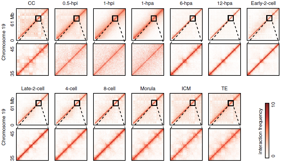 同濟(jì)大學(xué)生命科學(xué)與技術(shù)學(xué)院高紹榮團(tuán)隊(duì)與江賜忠團(tuán)隊(duì)在Nature Communications雜志發(fā)表了Hi-C互作的相關(guān)研究成果。他們采用經(jīng)過(guò)優(yōu)化的少量細(xì)胞全基因組染色質(zhì)構(gòu)象捕獲技術(shù)(sisHi-C),對(duì)小鼠SCNT胚胎發(fā)育過(guò)程進(jìn)行連續(xù)采樣,詳細(xì)描繪了SCNT植入前胚胎染色質(zhì)高級(jí)結(jié)構(gòu)的動(dòng)態(tài)變化過(guò)程。