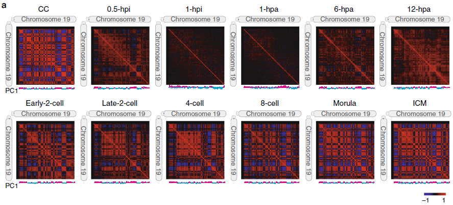 不同時(shí)期的胚胎的染色質(zhì)三維構(gòu)象見下圖,圖中分別展示了分辨率為100kb和40kb時(shí)的Hi-C互作矩陣。將CC(Cumulus cell)核注入無(wú)核卵母細(xì)胞后,染色質(zhì)結(jié)構(gòu)TADs和Compartments迅速溶解,并在6-hpa胚胎中部分恢復(fù)。令人驚訝的是,1-hpi和1-hpa單細(xì)胞胚胎遠(yuǎn)端相互作用明顯較少,并顯示出一致的相互作用模式,這與中期染色質(zhì)組織狀態(tài)高度相似。