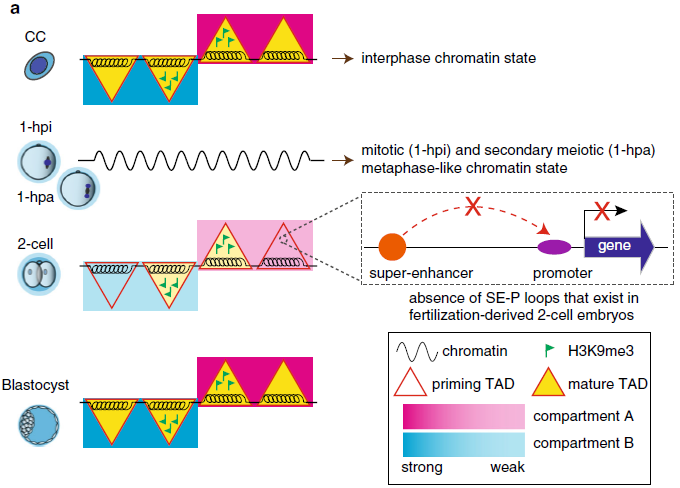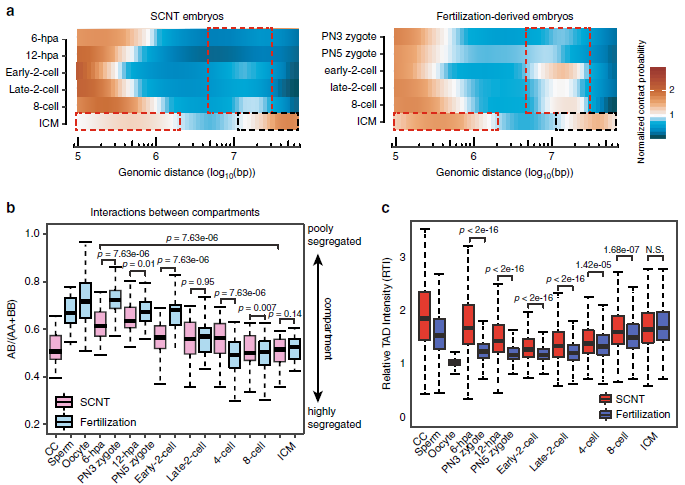 2020年4月14日,同濟(jì)大學(xué)生命科學(xué)與技術(shù)學(xué)院高紹榮團(tuán)隊(duì)與江賜忠團(tuán)隊(duì)在Nature Communications雜志在線發(fā)表了相關(guān)研究成果。他們采用經(jīng)過(guò)優(yōu)化的少量細(xì)胞全基因組染色質(zhì)構(gòu)象捕獲技術(shù)(in situ Hi-C),對(duì)小鼠SCNT胚胎發(fā)育過(guò)程進(jìn)行連續(xù)采樣,并詳細(xì)描繪了SCNT植入前胚胎染色質(zhì)高級(jí)結(jié)構(gòu)的動(dòng)態(tài)變化過(guò)程,同時(shí)說(shuō)明體細(xì)胞在移植到無(wú)核卵母細(xì)胞后,成熟的三維染色質(zhì)結(jié)構(gòu)是如何被重新編程為全能狀態(tài)的。