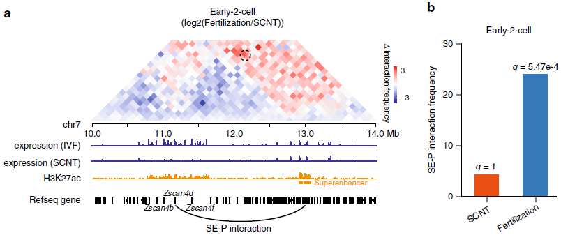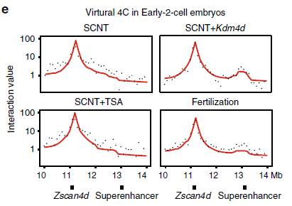 研究表明小鼠SCNT胚胎在合子基因組激活(ZGA)時(shí)期有大量的基因未能被正常激活。于是,作者探究了染色質(zhì)空間結(jié)構(gòu)的異常是否會(huì)導(dǎo)致增強(qiáng)子與啟動(dòng)子之間的相互作用無(wú)法成功建立。在早2細(xì)胞胚胎,發(fā)現(xiàn)關(guān)鍵基因Zscan4d的啟動(dòng)子與上游的超級(jí)增強(qiáng)子的SE-P相互作用在受精卵中很明顯,而在SCNT胚胎中則不存(圖5)。