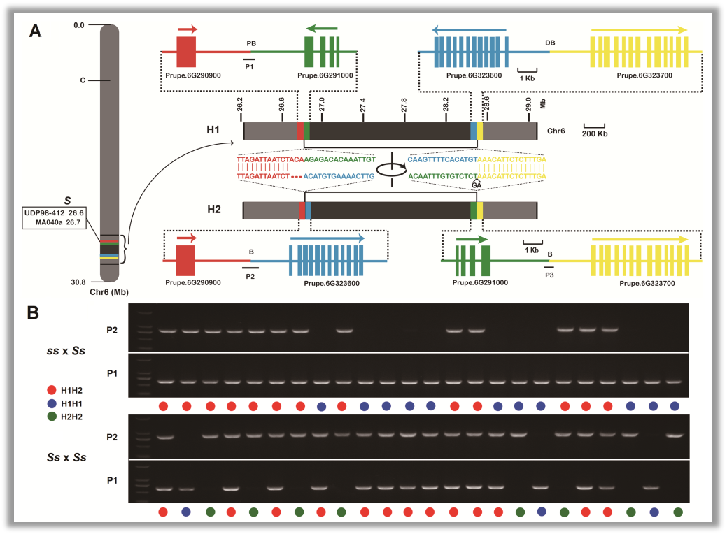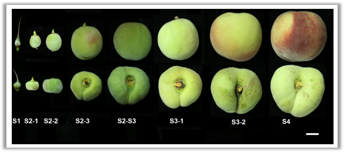 桃起源于250萬(wàn)年前的中國(guó)青藏高原的西南部,在中國(guó)已有4000年的栽培史,其中有一個(gè)獨(dú)特變種—蟠桃,蟠桃果實(shí)呈扁平狀,體積較小,和我們常見(jiàn)的圓形桃子有明顯區(qū)別,雖然長(zhǎng)相一般,不過(guò)它具有酸度低、糖含量高等優(yōu)異品質(zhì),受到越來(lái)越多的消費(fèi)者喜愛(ài)。蟠桃果實(shí)扁平的特征受6號(hào)染色體上的S位點(diǎn)調(diào)控,同時(shí)S位點(diǎn)與控制鮮重和果實(shí)敗育位點(diǎn)緊密連鎖。關(guān)于S位點(diǎn)的基因定位研究有多次報(bào)道,發(fā)現(xiàn)2個(gè)臨近候選基因(CAD1LRR-RLK)與果實(shí)扁平的性狀共分離,但后續(xù)又有研究顯示這2個(gè)基因并非與CAD1LRR-RLK共分離。所以,對(duì)于扁桃扁平性狀的遺傳基礎(chǔ)研究仍待繼續(xù)。
