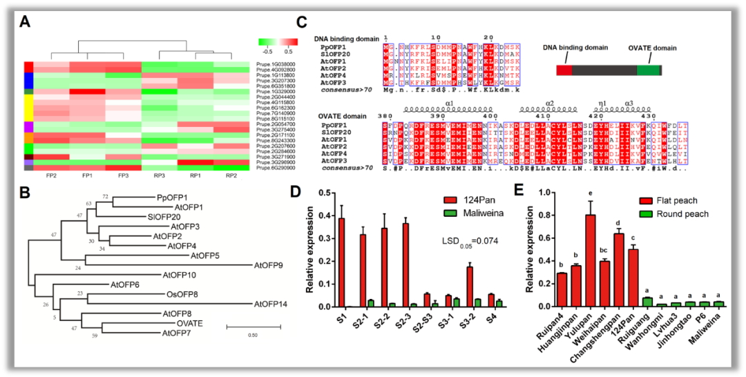 通過(guò)比較扁桃和圓桃果實(shí)發(fā)育過(guò)程中果實(shí)縱徑和果實(shí)橫徑的變化,發(fā)現(xiàn)在S2時(shí)期兩者果實(shí)增長(zhǎng)均較快(圖2),于是作者在S2時(shí)期選擇多個(gè)扁桃和圓桃進(jìn)行轉(zhuǎn)錄組測(cè)序,結(jié)果在S位點(diǎn)附近發(fā)現(xiàn)1個(gè)在扁桃中上調(diào)差異表達(dá)基因rupe.6G290900PpOFP1)(圖3A)。PpOFP1AtOFP1SlOFP20為同源基因,2個(gè)基因分別負(fù)調(diào)控?cái)M南芥細(xì)胞伸長(zhǎng)以及番茄子房發(fā)育,從而說(shuō)明PpOFP1很有可能是引起果實(shí)形狀變化的候選基因。在果實(shí)發(fā)育S2期,扁桃果實(shí)中PpOFP1表達(dá)量顯著高于圓桃(圖3D,E),RNA原位雜交也顯示PpOFP1基因在外皮層和內(nèi)皮層細(xì)胞分裂區(qū),該結(jié)果再次證實(shí)PpOFP1在果實(shí)縱向發(fā)育過(guò)程中發(fā)揮重要作用。