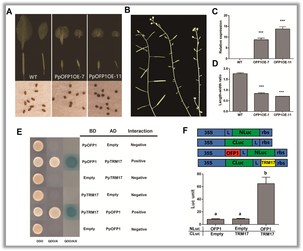 前期研究發(fā)現(xiàn)OFP基因家族與TRM基因家族存在互做來(lái)調(diào)控植物器官形狀,于是作者分析了可能與PpOFP1互做的TRM基因,在桃子基因組中篩選到1個(gè)可能的互做基因PpTRM17,通過(guò)酵母雙雜(圖4E)和螢火蟲(chóng)熒光素酶雙分子互補(bǔ)實(shí)驗(yàn)(圖4F),發(fā)現(xiàn)PpOFP1能夠與PpTRM17存在互做關(guān)系。