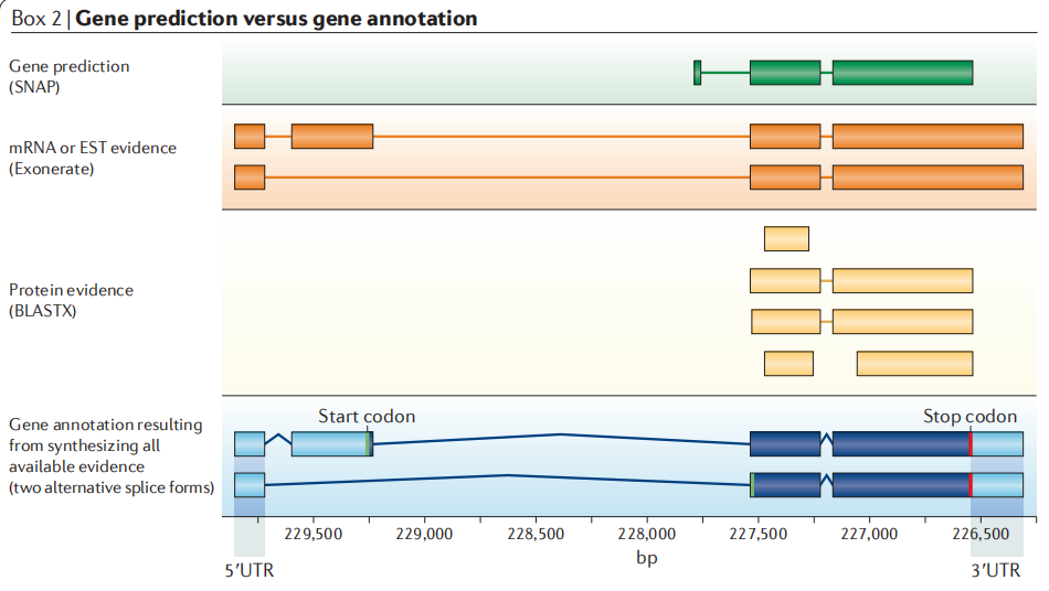 (3)基于轉(zhuǎn)錄組預(yù)測(cè)(transcriptome-based prediction):指通過(guò)物種各個(gè)組織混合的RNA-seq和三代全長(zhǎng)轉(zhuǎn)錄本數(shù)據(jù)數(shù)據(jù)來(lái)輔助預(yù)測(cè)。由于轉(zhuǎn)錄組這種數(shù)據(jù)是轉(zhuǎn)錄本結(jié)構(gòu)的直接反應(yīng),因而利用此種類型數(shù)據(jù),可以比較真實(shí)準(zhǔn)確的確定外顯子區(qū)域和剪切位點(diǎn),在基因預(yù)測(cè)三種策略中屬于可靠性最高的策略。常用的軟件有PASA、TransDecoder、GeneMarkS-T等。