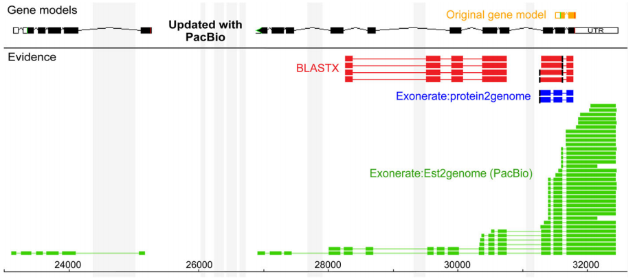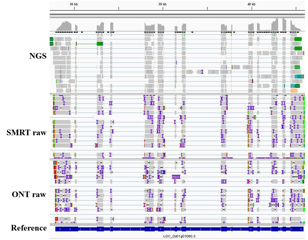 基于三代測(cè)序平臺(tái)可以直接獲取轉(zhuǎn)錄本的5ˊ到3ˊ高質(zhì)量全長(zhǎng)序列,無(wú)需組裝,一條read即可跨越全長(zhǎng)轉(zhuǎn)錄本,因此通過(guò)將read比對(duì)基因組就能夠非常容易的確定基因在基因組上的位置和其完整結(jié)構(gòu),因而非常有利于基因的注釋工作,且準(zhǔn)確性較高(參見(jiàn)下圖以水稻一個(gè)基因?yàn)槔?/p>