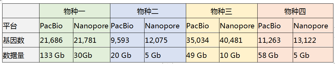 表1 不同物種PacBio與Nanopore獲取相近高準(zhǔn)確基因數(shù)量時(shí)對(duì)應(yīng)所需數(shù)據(jù)量