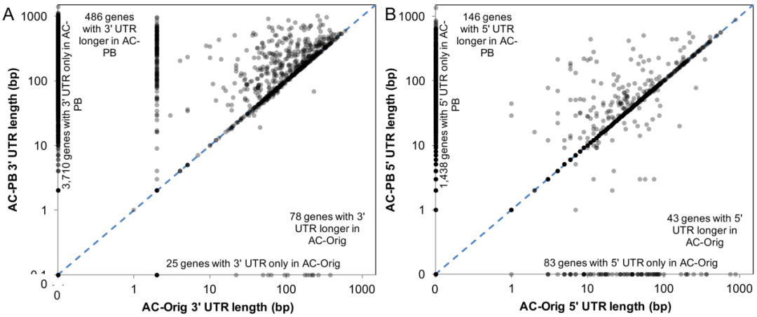 圖6 (A)3’UTR和(B)5’UTR的全長(zhǎng)和RNA-seq之間UTR長(zhǎng)度的差異