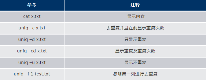 uniq需要配合sort進(jìn)行使用,把重復(fù)的內(nèi)容排序到一起,以下為最常用的幾個(gè)命令實(shí)例