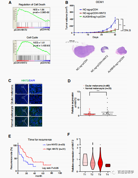 在眼黑色素瘤細胞中,在mRNA水平和蛋白水平均過表達HINT2。發(fā)現(xiàn)過表達HINT2后,眼黑色素瘤細胞的細胞增殖、細胞遷移、和克隆形成明顯受到抑制,細胞凋亡增加。此外,GSEA顯示在腫瘤細胞中HINT2促進凋亡和細胞死亡(Fig3a)。為了確定HINT2在體內(nèi)腫瘤特征中的作用,過表達HINT2的眼黑色素瘤細胞進行了皮下移植。結果顯示:相對于對照組(Fig3b, A組)來說,實驗組HINT2過表達組(Fig3b, B組)腫瘤體積持續(xù)降低。為了研究這些蛋白表達的變化是否在樣本中發(fā)生,在眼黑色素瘤和正常組織中進行IF實驗(Fig3c),發(fā)現(xiàn)HINT2確實在腫瘤樣本中下調。除此之外,在眼黑色素瘤組織樣本中,低表達的HINT2與不良預后高度相關(Fig3e)。