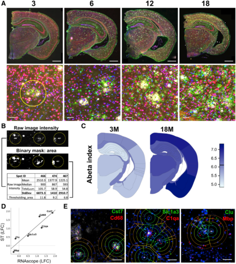 為了解基因表達(dá)的變化,作者進(jìn)行了兩個(gè)差異表達(dá)分析。首先比較AppNL-G-F?和 C57BL/6(基因模型),其次是Aβ沉積對基因表達(dá)的影響(Aβ模型)。作者使用6個(gè)轉(zhuǎn)錄本進(jìn)行經(jīng)典的RNA原位雜交實(shí)驗(yàn)來驗(yàn)證Aβ模型(圖2D&E),根據(jù)模型,18月齡的AppNL-G-F,Cst7,Cd68,C1qa,Slc1a3,Clu和Mbp表達(dá)異常。在圖2D中可以看到,ST的數(shù)據(jù)和RNA原位雜交數(shù)據(jù)高度相關(guān),這也證實(shí)了本方法的有效性。
