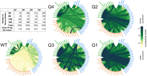 在WT中,所有PIGs的關(guān)聯(lián)相對較低,PIG被分為三個(gè)簇(圖5,綠、藍(lán)、橙)。ISS實(shí)驗(yàn)(圖4H)證明了在綠色簇中,星形膠質(zhì)細(xì)胞基因(7/12)富集,而藍(lán)色(14/23)和橙色(14/28)簇聚集了小膠質(zhì)基因中表達(dá)的PIGs。在WT中,橙色的PIGs幾乎不關(guān)聯(lián),而AppNL-G-F小鼠中,在接觸增長的Aβ后,這些PIGs的基因被招募。隨著Aβ指標(biāo)增長,PIGs內(nèi)部和相互之間的關(guān)聯(lián)增強(qiáng)。在Q4-Q1中,隨蛋白斑積累程度增加,互作關(guān)系明顯增加。