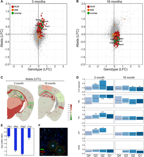 作者進(jìn)而更詳細(xì)地從Aβ指標(biāo)和OLIG表達(dá)的關(guān)系方面分析這些區(qū)域的不同。在圖2中,Aβ沉積隨疾病的進(jìn)展而不同。甚至在3個(gè)月時(shí),有些TDs暴露于Aβ(圖5,Q1中179個(gè)TDs)。隨著Q4-Q2中TDs的Aβ緩慢增長,OLIG表達(dá)增加(圖6D)。但是,三月齡有著*高Aβ暴露(Q1,比Q4中Aβ高21倍)的TDs中OLIG的表達(dá)存在一種降低的趨勢。另外,低Aβ暴露的TDs中OLIG模塊的基因?qū)Φ倪B接強(qiáng)度之和*強(qiáng)。為了進(jìn)一步證明發(fā)現(xiàn),作者對三月齡AppNL-G-F小鼠的整個(gè)冠狀切片,設(shè)計(jì)四個(gè)OLIGs(Plp1、Mbp、Olig2Cnp)探針做RNA原位雜交(圖6E&F)。結(jié)果顯示,在三月齡小鼠稠密的淀粉樣蛋白斑周圍,這4個(gè)OLIGs明顯減少。可以推測,在輕度Aβ暴露下,OLIG模塊高表達(dá)和相互連接,但在高密度Aβ積累的微環(huán)境中表達(dá)減少。因此,部分OLIG模塊的區(qū)域差異與不同的Aβ暴露有關(guān)。