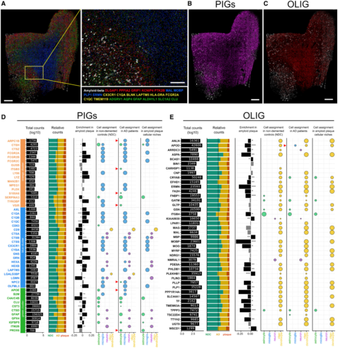 作者使用3名AD患者和3名正常對照組死后的人腦樣本進(jìn)行實(shí)驗(yàn)。AD大腦處于淀粉蛋白斑C階段和神經(jīng)元糾纏V-VI階段的疾病進(jìn)展期。研究描繪了與AD相關(guān)的額上回組織譜,總共報(bào)告了222個(gè)基因表達(dá)譜,包括45個(gè)人PIGs同源序列,OLIG模塊中42個(gè)斑塊反應(yīng)基因的同源序列,以及一系列細(xì)胞類型Marker。這些細(xì)胞Marker很好地在細(xì)胞分辨率下描繪了大腦區(qū)域(圖7A)。PIG模塊(圖7B,紫色)和OLIG模塊(圖7C,紅色)基因如預(yù)期的在大腦灰質(zhì)和白質(zhì)中富集。