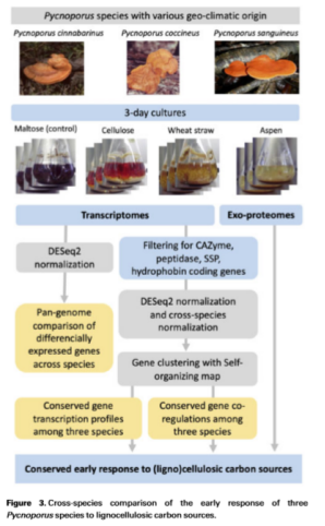 選取四種不同地理分布的擔(dān)子菌門/密孔菌屬真菌(P.coccineus、P.sanguineusand、P. puniceus、P.cinnabarinus)研究其在不同類型的纖維素基質(zhì)下相關(guān)酶的代謝情況。通過設(shè)置不同碳素培養(yǎng)基:麥芽糖(對照)、秸稈、松木、楊木,模擬對自然界中不同材質(zhì)的木材的分解能力。探究Pycnoporus屬在基因組、轉(zhuǎn)錄組、分泌蛋白組層面的共性和差異性,以期找出它們在木質(zhì)纖維素降解上存在的共性機(jī)制。