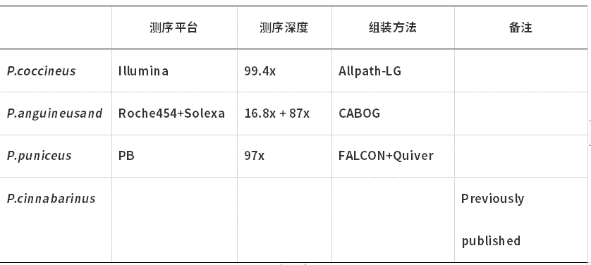 分別對P.coccineus、P.sanguineusand、P. puniceus、P.cinnabarinus的基因組進(jìn)行測序和組裝,四種真菌基因組大小差異不大,編碼基因組的數(shù)量上也比較接近。