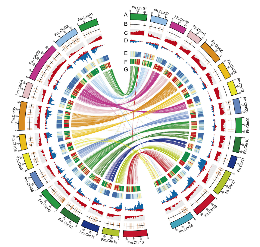 兩種榕樹基因組比較發(fā)現(xiàn)有大量結(jié)構(gòu)變異,細(xì)葉榕的3號(hào)染色體FmChr03,與對(duì)葉榕3號(hào)及7號(hào)染色體(FhChr03、FhChr07)發(fā)生融合或裂變事件,重排區(qū)內(nèi)的基因富集顯示主要與植物免疫功能有關(guān)。兩種榕樹在真雙子葉植物的三倍體事件之后,均沒(méi)有檢測(cè)到全基因組復(fù)制(WGD)事件。全基因組比對(duì)分析表明,兩個(gè)榕樹基因組共有約38Mb 片段重復(fù)(SDs),表明SD是基因組規(guī)模擴(kuò)大的主要因素。
